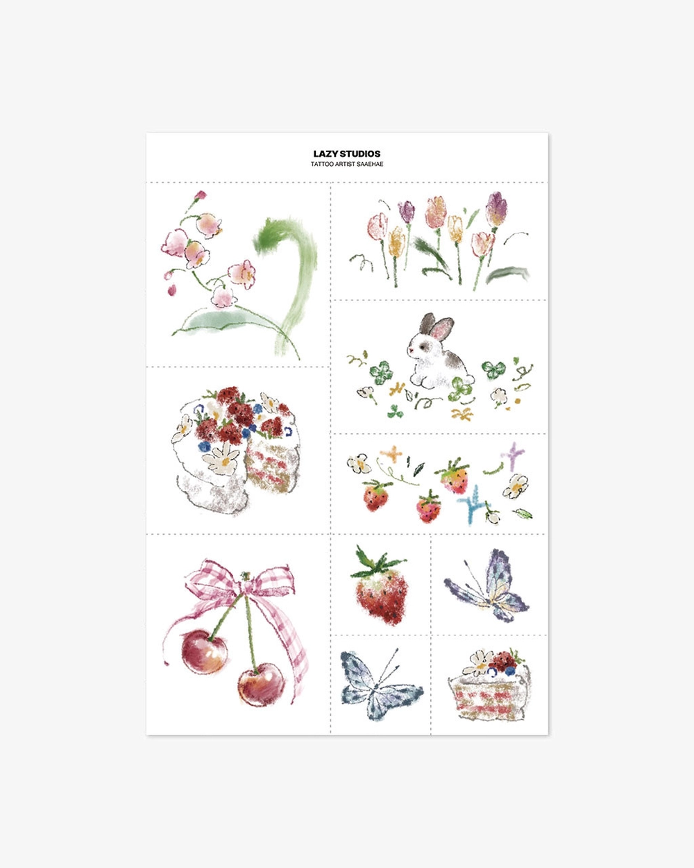 타투 아티스트 새해의 템포러리 타투를 소개합니다. 부드러운 컬러와 섬세한 질감을 통해 따뜻한 수채화 감성을 담아낸 디자인입니다. 꽃, 과일, 동물과 같은 자연의 요소를 활용해 사랑스럽고 아기자기한 무드를 강조하였으며, 개별적으로 사용할 수 있을 뿐만 아니라 다양한 도안을 조합하여 연출할 수 있도록 구성하였습니다. 은은하고 자연스러운 색감이 피부에 고스란히 녹아들어, 데일리로도 부담 없이 활용할 수 있는 디자인입니다.