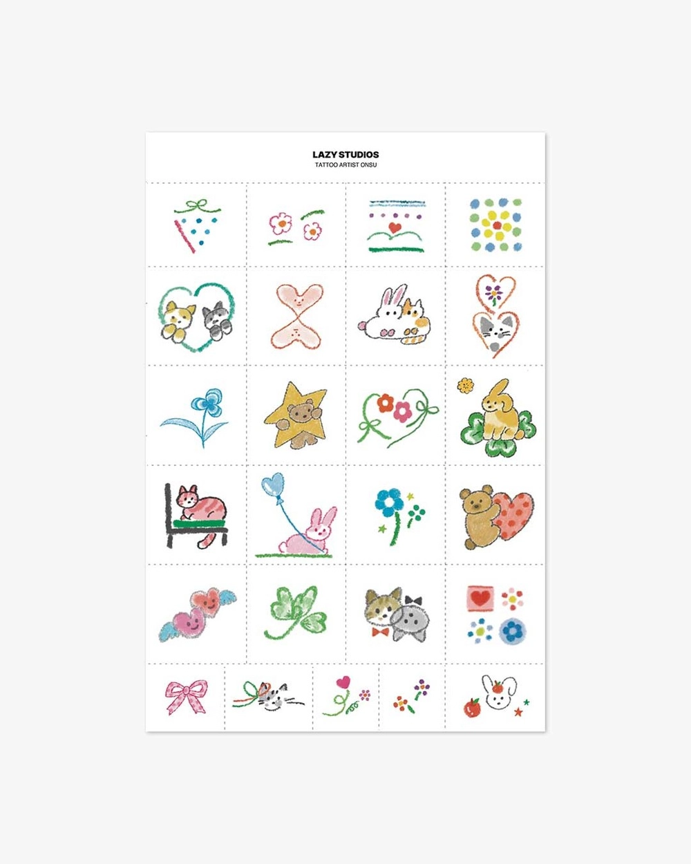 타투 아티스트 온수의 템포러리 타투를 소개합니다. 두근거리는 설렘을 담아, 온수의 귀엽고 엉뚱한 상상들을 알록달록한 봄의 색깔로 가득 채운 템포러리 타투입니다.