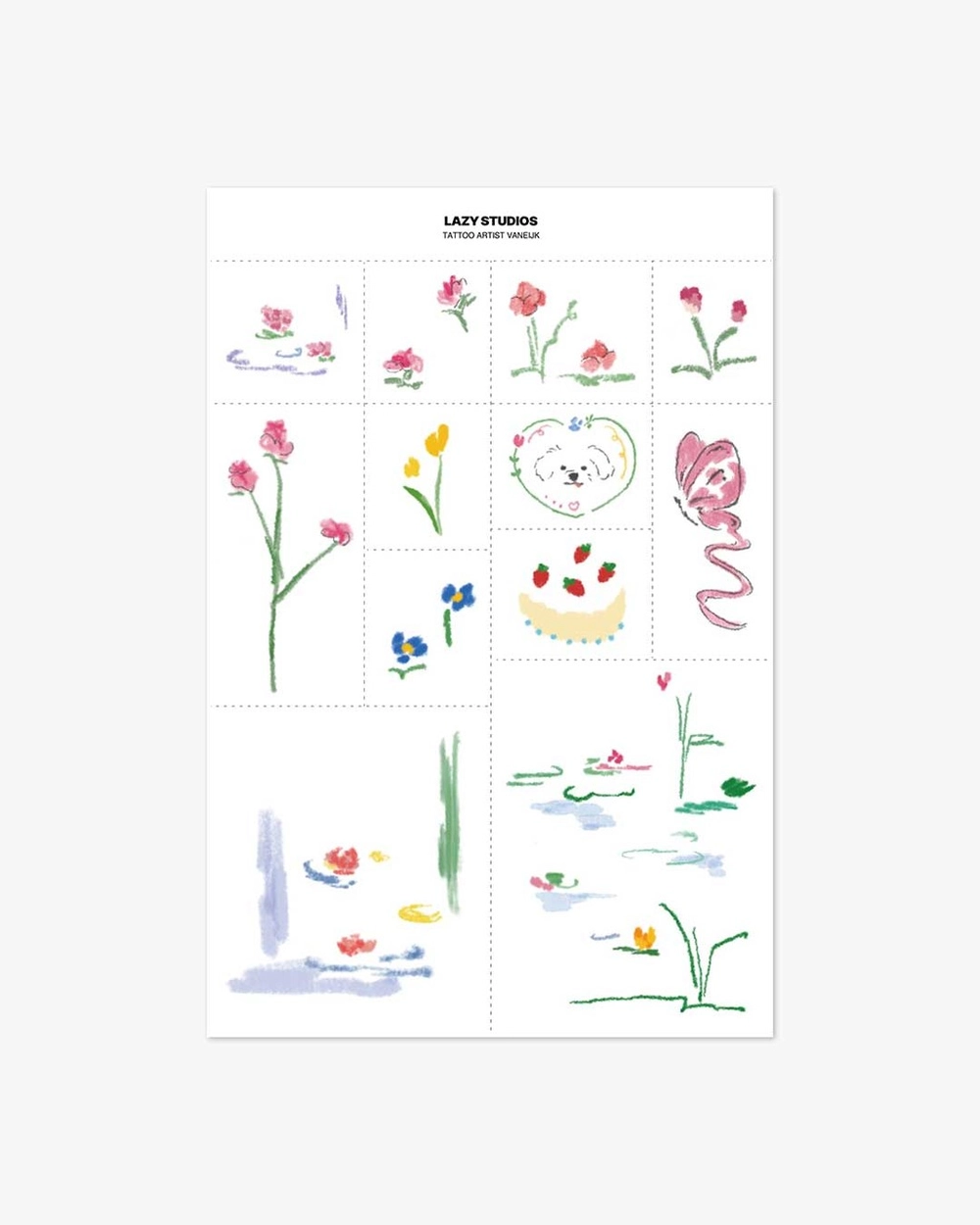 반에이크 특유의 섬세한 색연필 터치와 맑게 번지는 수채화 느낌이 어우러져, 차분하면서도 사랑스러운 컬러 팔레트가 돋보이는 디자인입니다. 어린 시절 그림일기처럼 따뜻하고 아련한 감성을 담고 있습니다. 작은 꽃, 수련, 튤립, 팬지, 강아지, 케이크, 나비 등 일상의 소소한 행복과 자연의 아름다움을 아기자기하게 담았습니다. 개별로도, 함께 조합해도 자연스럽게 어울립니다. 부드러운 파스텔 톤과 생기 있는 컬러가 조화롭게 표현되어 피부 위에서 은은하게 빛납니다.